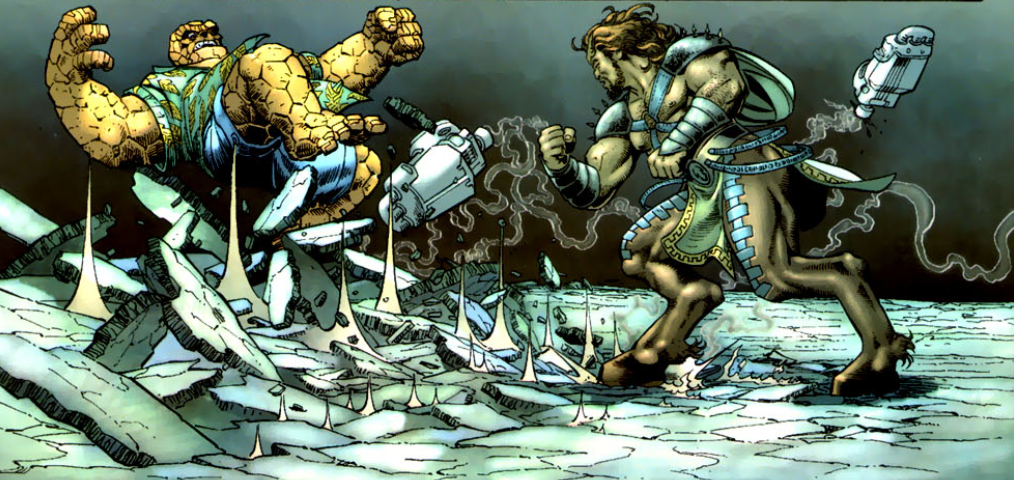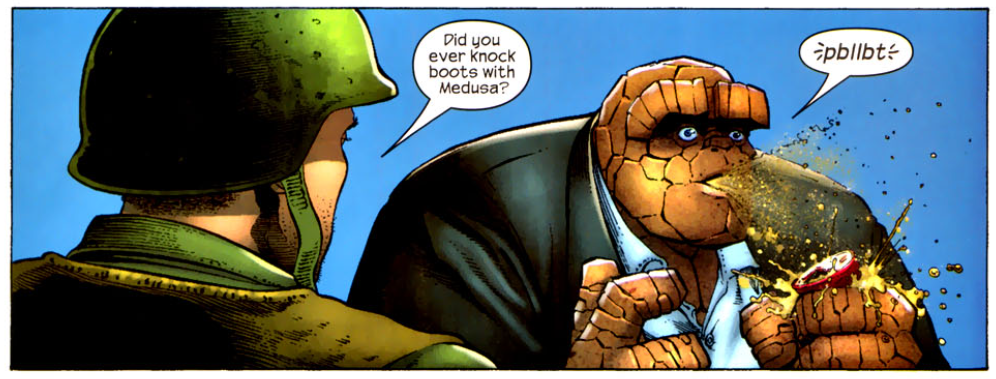 Charlie says he’s an army brat, coming from a family of army brats. He envies Ben, saying superheroes don’t have to take orders from anyone. Ben disagrees, telling a story of how the US President once ordered the FF to handle a crisis in Attilan, the Inhumans’ secret city. Reed outfitted Ben with flying rocket shoes for this mission, which malfunction and make Ben look foolish. He meets with Gorgon – who, let’s not forget, once singlehandedly defeated the entire FF. Gorgon says the US Army is threatening the Inhumans. Gorgon is outraged, and he and Ben fight. Karnak and Triton show up, saying that they are preparing for battle against the US soldiers. Ben and Gorgon fight for a bit more before Medusa arrives and breaks them up.