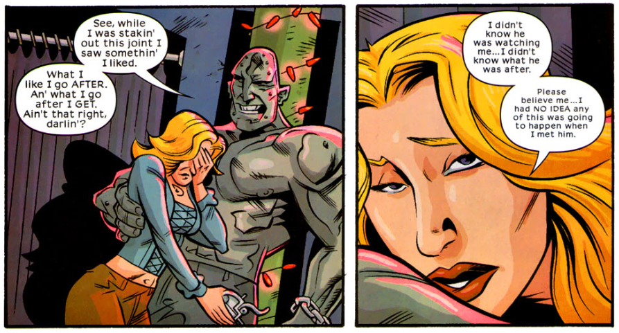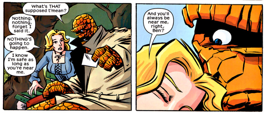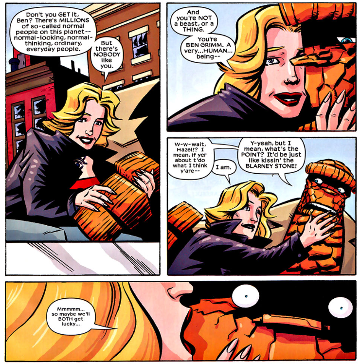 When threatening to beat up the Yancy Street Gang, Ben meets a woman in a dumpster (!) who can look inside the cracks in his rocky skin. Inside, she sees a desert with pyramids, and her and Ben meeting in front of them. Back in the present, the woman, named Hazel, says she’s scavenging dumpsters for items to use in her landscape design business. She found an intriguing stone head. She patches up Ben’s torn coat, in exchange for him giving her a tour of Yancy Street. They go for lunch, and she says he’s a lot nicer than the tabloids. She tells him about losing her parents at a young age, and her life as an artsy type. That night, they go to Coney Island, and Hazel tells Ben she finds him incredibly attractive. Then a mysterious wind kicks up and she insists on going home, all while a shadowy figure watches them.