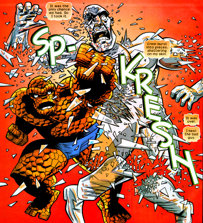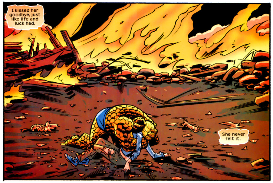 After a short retelling of the FF’s origin from Ben’s perspective, we start with Ben as he stands among the flaming wreckage of what used to be Yancy Street. Then we flash back to the FF fighting Red Ghost and the Super-Apes aboard a satellite. After saving the day, Ben muses about how the routine never ends, and how he’s tired of being the one who always takes a beating for the team. Back home, Ben muses about how he’ll never have a normal life. He visits Alicia, who has a seeing eye dog named Silver. Alicia tries to calm him down, but he’s too angry. He then goes back to the old neighborhood on Yancy Street, where pranksters throw eggs and rotten vegetables at him.
