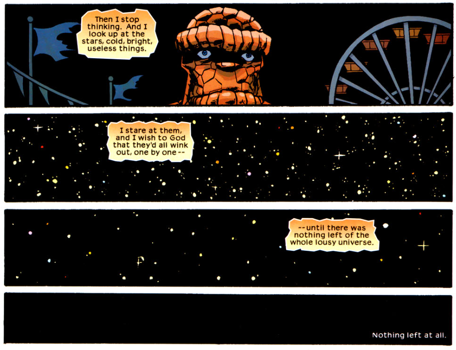 Ben wanders the streets alone, ending up back at Coney Island, and wishing all the stars in the night sky would go out, until there is “nothing left at all.” And on that dour note, the comic ends.