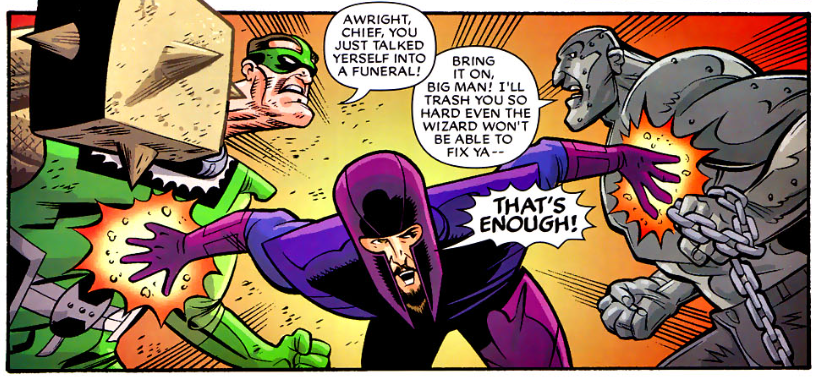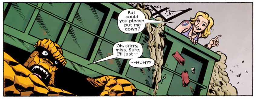 At the start of issue #4, the Yancy Streeters say Hazel herself is original Yancy Street. Ben chases them off, not wanting them to get involved. He meets us with Trapster, who finds an FF signal flare in Ben’s coat. It’s a distraction, allowing Ben to destroy Trapster’s glue gun. Trapster gives up Hazel’s location. Ben finds the Frightful Four there, and he hands over the Nullifier. The villains fight with each other over who gets to use it, only to Hazel to grab it.