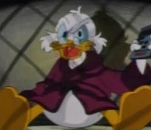 Scrooge deduces that only Loudmouth has footage of the imposter. He investigates Loudmouth’s mansion and finds the imposter Mallard costume. Loudmouth knocks out Scrooge and ties him up atop a building. He plans to continue framing Scrooge and profiting from it. Loudmouth, dressed as the Mallard, steals some gold and then fights Gizmoduck. Gizmoduck thinks Loudmouth is Scrooge, though, so he pulls his punches. Scrooge escapes, and he joins the fight in a nearby junkyard. Loudmouth traps Gizmoduck with an electromagnet. Scrooge shows up in his Mallard costume, and the two Mallards fight. Scrooge wins, and exposes Loudmouth in front of the cops and TV reporters. Scrooge destroys the Masked Mallard costume, saying he no longer needs a mask to do good deeds.