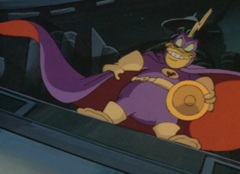 Your move, creep: While Gizmoduck has been pretty much unstoppable in the past, in this episode a missile and then a magnet defeat him. I guess this has to happen so the Masked Mallard can swoop in and be the hero.