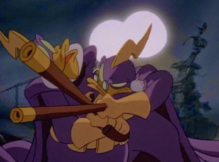 Let’s get dangerous: Several episodes of DuckTales are singled out for being concept for a potential spinoff series, usually starring Launchpad. This one, more than any other, is a proof of concept for what would soon become Darkwing Duck.