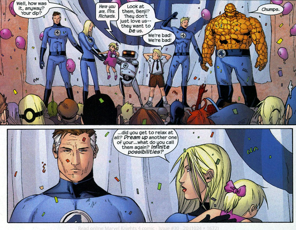 Who’s this Martin Simms guy? He’s the person Reed rescued from the rooftop in Marvel Knights: 4 #14. The Bethany Palmer character, however, has this as her only appearance.
