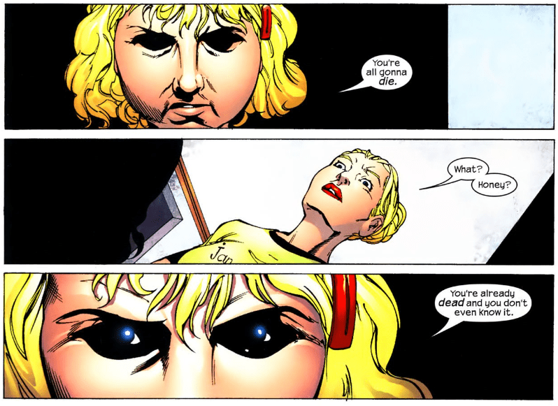 Trivia time: Agatha Harkness was killed by Scarlet Witch during all the craziness that went down in the Avengers Disassembled event. She’ll later be brought back to life by Natalya Romanov in the Scarlet Witch solo series.