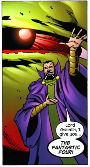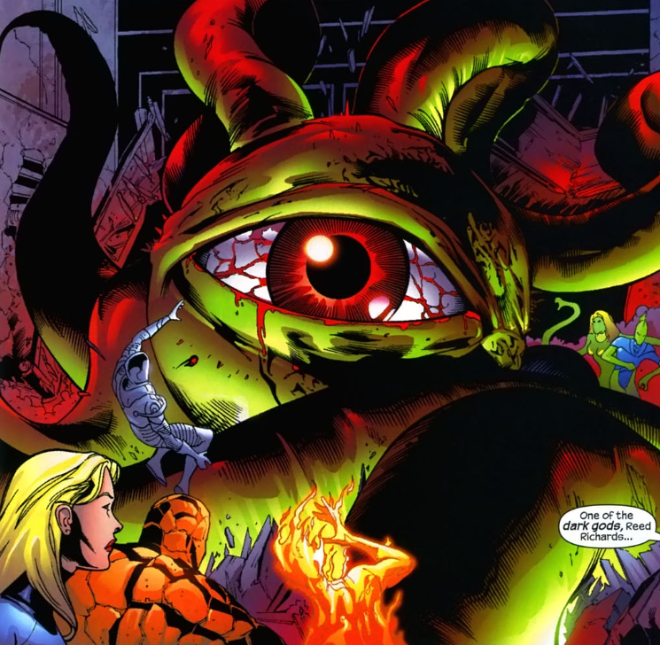 On the way to Whisper Hill, the FF are attacked by Salem’s Seven. The Seven catch the FF by surprise, but the heroes quickly rally and take out the Seven. They enter Agatha’s mansion to find her opening a magic portal. There’s another fight with the Seven, with the FF again easily winning. Agatha, however, opens the portal and out comes Shuma-Gorath, one of the dark gods of the universe. Agatha says she has banished Dr. Strange and will take his place as the new sorcerer supreme. Then Agatha drops another disguise, revealing that this isn’t Agatha but her partner in crime, Nicholas Scratch.