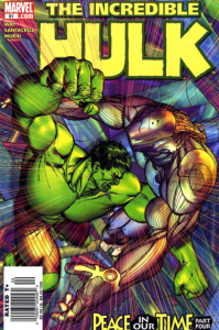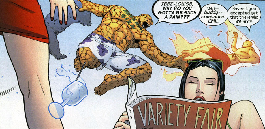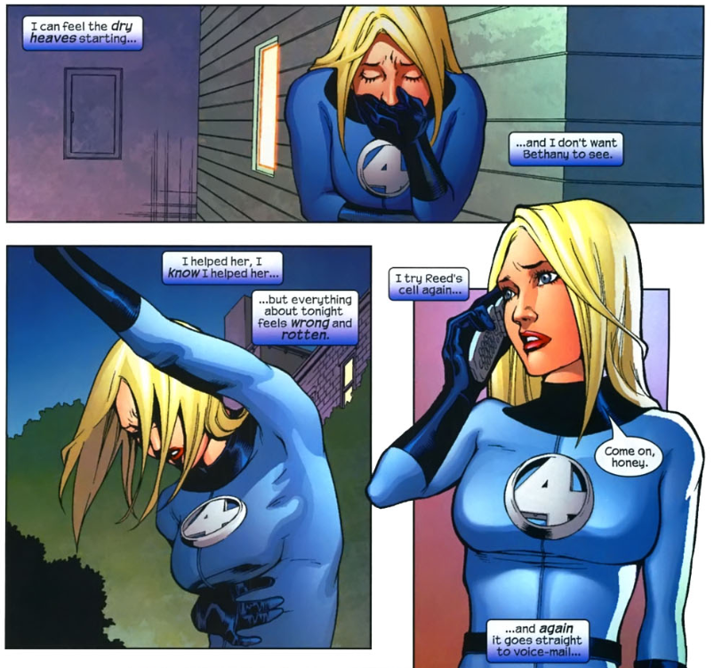 Issue #28 drops the Marvel Knights moniker, and the series is renamed just 4. The Nicholas Scratch plots is abruptly dropped. Instead, we get Sue running the business side of Fantastic Four Inc., as one employee, Bethany Palmer, comes to her with concern that her husband has become abusive. Sue and Bethany confront the husband, and Sue goes all Punisher on him, threatening to kill him. She offers Bethany a place to stay at the new Baxter Building. Overwhelmed with worry about her actions, Sue tries calling Reed, but he doesn’t answer. Reed is with an old friend, Martin Simms, who dying in the hospital. Through a mental telepathy earpiece (!) Reed witnesses Martin relive his life in the last few moments of his death. That night, Sue is upset that Reed wasn’t there when she called. They talk things over, and all seems well, but the caption tells us this is the first step toward… civil war.