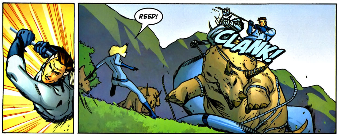 Four and a half: In the Savage Land, Reed says seeing dinosaurs makes him feel like a kid again. Sue says Franklin must have inherited his love of dinosaurs from Reed.