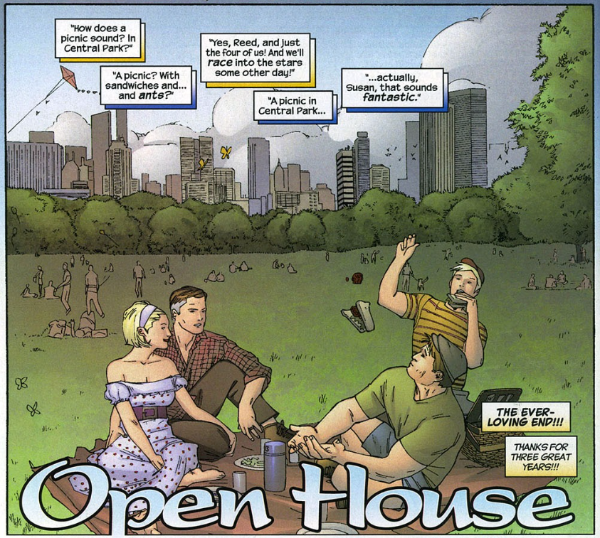 The final issue, #30, opens with a lot of day-in-the-life stuff for our heroes. Sue is preparing an open house at the new Baxter Building, complete with a new mural painted of the heroes. Johnny and Ben have a playful bickering fight at the pool alongside Alicia and Kourtney. Namor the Submariner shows up Wanting to speak with Reed, but Reed is in his sensory depravation chamber, pondering infinite possibilities. The Inhuman royal family also shows up for the open house, having settled their differences from a few issues back. Elsewhere, Ben takes Alicia to visit her father the Puppet Master, who is in some sort of facility. He’s become a weary invalid, and she leaves him with a tiny piece of clay, asking what could go wrong. Dr. Strange shows up at the open house with the Salem Seven, saying they are friends now. Namor and Reed discuss “bridge-building” between super-folk like them and the general public. Sue asks Reed about his study of infinite possibilities, and we saw an alternate reality in which the FF waited until later to take their famous space flight, and instead enjoyed a lovely day in Central Park instead being bombarded by cosmic rays. Reed says, “That sounds fantastic.”