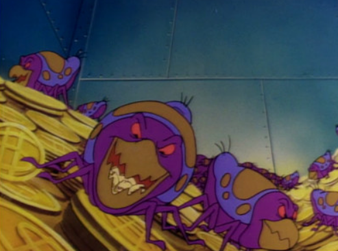 The mites wreck the bean factory where Fenton once worked, which is owned by Scrooge. Fenton dons the Gizmoduck armor to rescue all the workers inside. Then they spot Dijon leaing the mites toward the money bin. The mites then attack him, eating their way through his armor. The National Guard arrives (!) and even they are no match for the mites. Scrooge goes to Gyro Gearloose for help. Gyro is working on an automatic gum-chewing machine (!), only for the mites to get caught up in a giant gum bubble. The bubble floats towards the money bin. Dijon pops it, and the mites head for the bin.