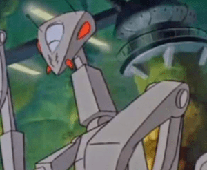 Your move, creep: As Gizmoduck, Fenton’s mother first generates a tornado to fight the robot. Then she does the forbidden move of pressing all the suit’s buttons at once. This causes a massive explosion that destroys the robot, but only winds Fenton’s mom.