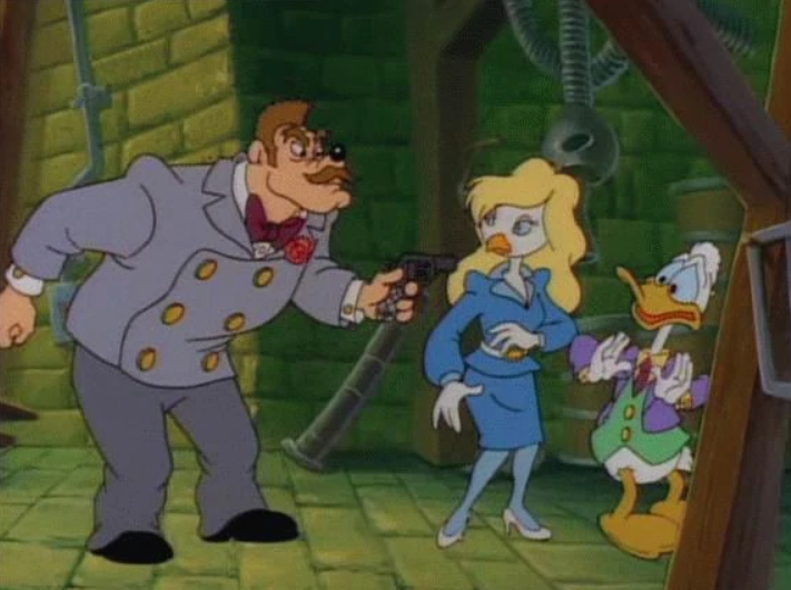 Agent X and Goldfeather use the robot to attack armored trucks transporting Scrooge’s money. Fenton fights the robot by electrifying a nearby telephone pole. Then Fenton’s mother arrives as Gizmoduck to save the day. After some more slapstick, Fenton’s mom succeeds in destroying the robot, and Scrooge nabs the two spies. Scrooge wants to reward Fenton by finally agreeing to give him a week off, only for Fenton to get sick for real this time.