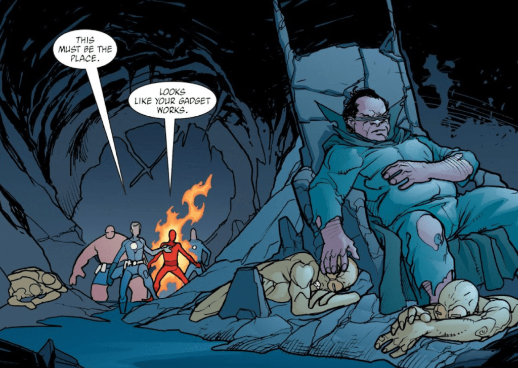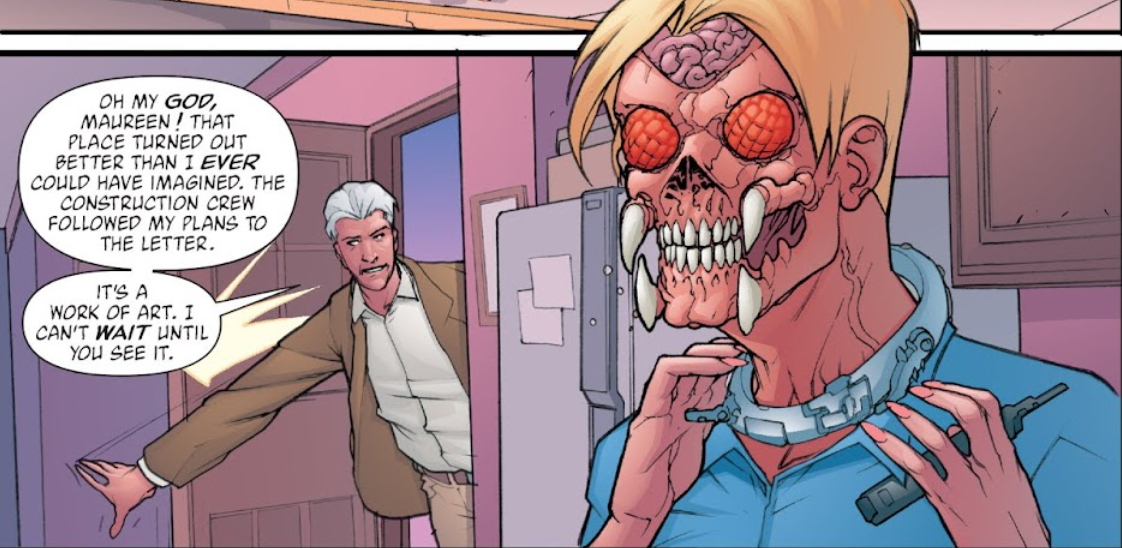 Reed then comes up with a device based on all the villain DNA the Puppet Master and the Mad Thinker took in issue #1, which will allow the FF to track the villains’ movements. The team uses it to track down the Mole Man deep underground. They try to apprehend him while he’s sleeping, only for one of his subterranean monsters to defend him. After a big fight, the Mole Man surrenders when the cavern collapses. Reed has another chat with LMD Fury, admitting that he’s thinking more rational and less paranoid. We then join Andrew at home, where he’s been working overtime on the prison. And we’re reminded that he thinks his wife is normal, when she’s really a gross insect-like creature. What appears to be his actual wife’s corpse is sitting in one corner, creepily.