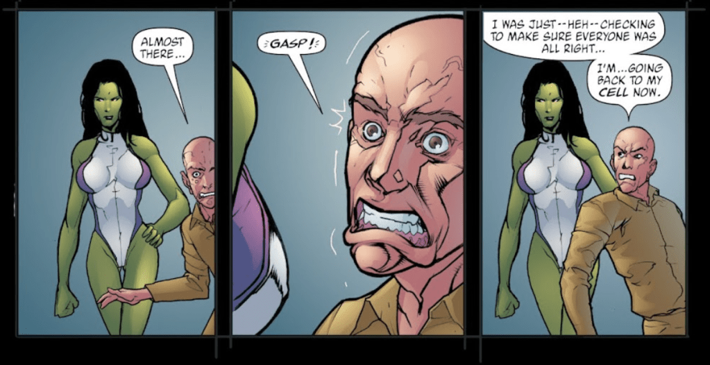 Andrew takes his wife on a tour of the prison, despite the Warden’s objections. She reveals her true face, much to Andrew’s objections. She then whips out a gun and shoots up the place. She takes over the control room and sets all the villains free. Then the Mad Thinker shows up, saying he and the wife were working together the whole time, and all is going according to plan.