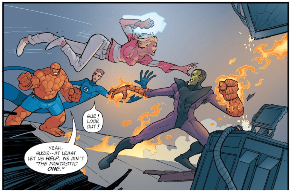 Unstable molecule: When Ben and Reed take a break from apprehending all the villains, Ben complains about being bruised, and Reed says with his stretching powers, he’s not able to be bruised.