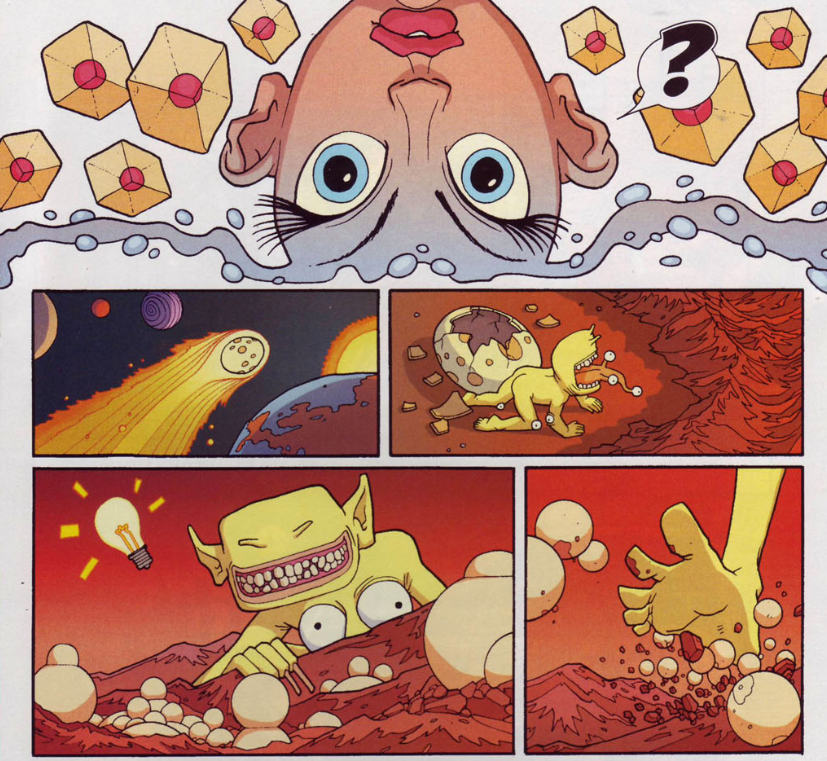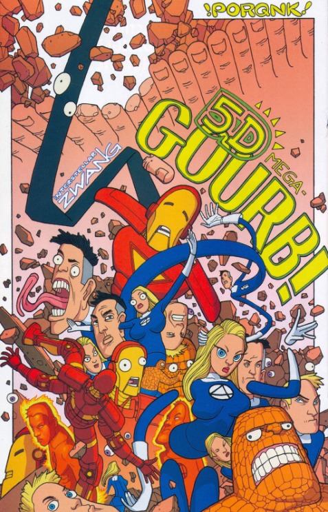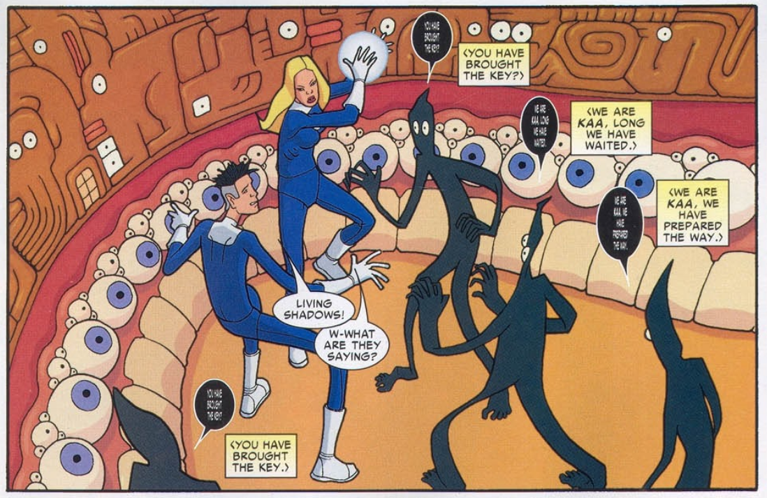 The heroes explore rooms made of massive eyes, fingers, and teeth. They are confronted by “living shadows” called Kaa, who say they are waiting for a key. Reed says reality is warping, while the Kaa break the fourth wall and talk about turning pages. The Kaa are preparing something called “the tearing.” Dr. Yamane disrobes, revealing his body covered with eyeball tattoos (or maybe they are eyeballs). He says the paleontologists were secretly a cult who worshipped kaiju as gods. He is the son of one of them, and he’s here to complete the ritual. He does some weird dance, and time and space tear apart. This is depicted by having one of the shadows appear to tear through the comic page itself. The caption tells us this is a “5-D Mega-Gourb!” Sure, why not?
