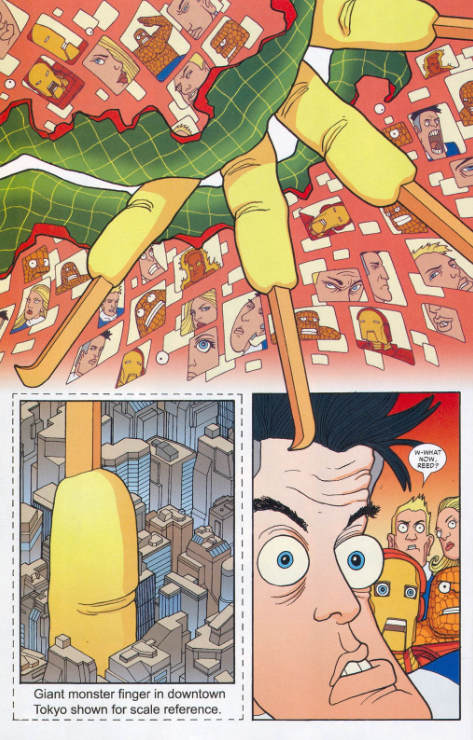 The FF visit Tokyo, enjoying their celebrity status at the ribbon cutting for the Tokyo Giant Monster Museum and Expo Center. Also present is Otetsukun, a skyscraper-sized robot that has protected Japan from giant monster attacks for decades. But there haven’t been any monster attacks in a generation, so Otetsukun serves as a sort of monument these days. The FF tour the museum, where curator Dr. Yamane tells them about scientific advances Japan has made thanks to studying the remains of the giant monsters. Just as Reed questions the ethics of this, billionaire Tony Stark arrives, hoping for an economic partnership with the museum.