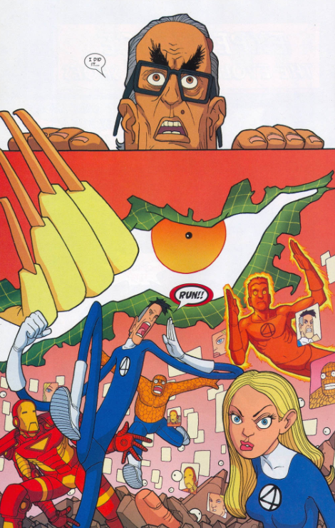 Reed then deduces that Monster Island is not merely a giant machine in disguise, but a giant syringe (!). Johnny ignites the dormant volcano under the machine, Reed mans the machine’s controls, and Ben protects them from an attack by some other random monster down there. The volcano/syringe pokes the Apocalypse Beast in the eye, and all the Moloids fly upward into it. The creature turns inside out (!) and flies back into space. The Mole Man breaks down crying, remembering that at least one Moloid had a name… Noah.