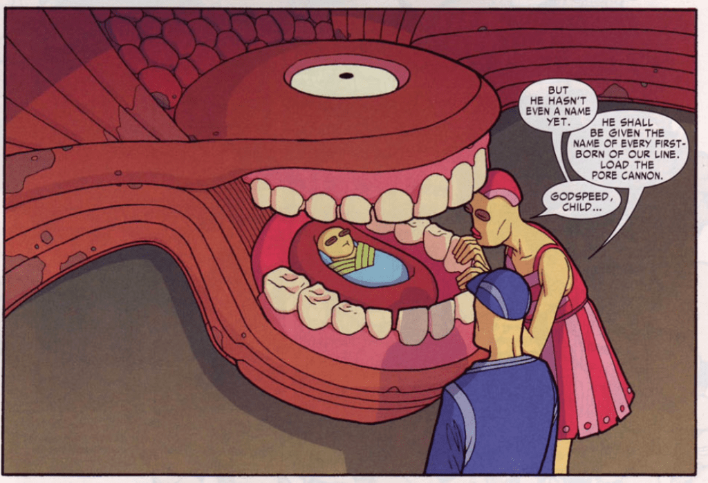 Reed concludes that the Moloids were a virus all along, bio-engineered for the purpose of driving off the Apocalypse Beast. Reed and Sue are reunited, as she and Iron Man made it out okay. Cut to the year 12,425 A.D., where two Moloids discuss how their once-great civilization is doomed, and their world’s resources are all but spent. They place their infant child into a pod and launch the baby into space, in hopes that it will find a new home on a new world. No, the baby isn’t named Kal or Clark. His name is Noah.