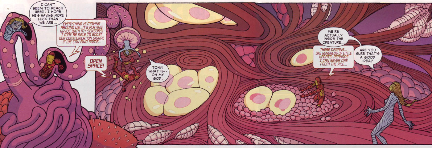 In issue #3, The FF, Iron Man, and Yamane travel to the North Pole, searching for this threat the kaiju warned them about. They discover the remains of a paleontological expedition that vanished forty years earlier. They find what appears to be a giant structure under the ice. They enter it, and here’s where the artwork gets so wild and off-the-wall that I’m not sure what’s happening exactly.