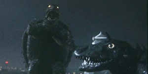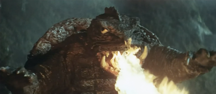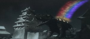 Big baddie: Barugon has ice breath, which conveniently counters Gamera’s fire breath. He also has his inexplicable rainbow attack, shooting pretty lights out of his back to attack threats behind him. The rainbow looks silly, but it causes massive destruction. We’re not really told where Barugon comes from or what he wants, though the island natives where he comes from suggest Barugon is magical/supernatural in nature.