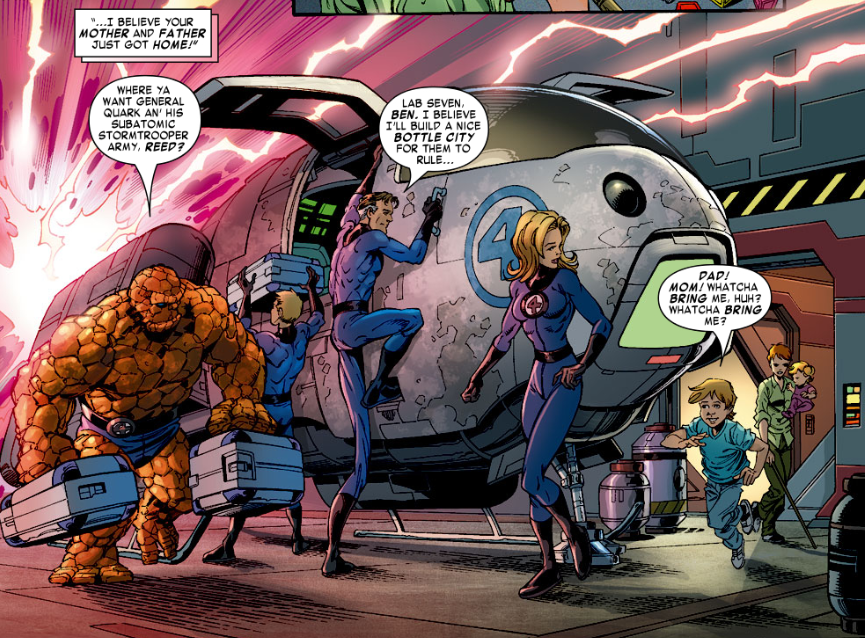 Fade out: In the office, Sue asks Jian about an invoice for Vibranium. Although Black Panther is a long-standing ally to the FF, I find it unlikely that Wakanda is selling its most important resource to anyone. The Marvel Wiki states there’s also an Antarctic Vibranium, which was involved in a She-Hulk story, so perhaps this is the Vibranium the FF are buying.