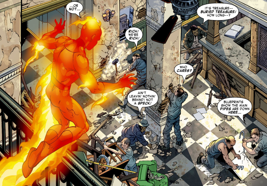 Alicia is babysitting little Franklin and Valeria when the FF return from an unseen adventure in the Microverse. Alicia tells everyone that NYC’s Chesler Hotel is being torn down, not by the city, but by the building’s residents. They’ve apparently gone insane and are holding hostages inside. Johnny flies to the building, where he finds all the residents are destroying the building from the inside because they’re searching for treasure hidden in the walls or under the floors.
