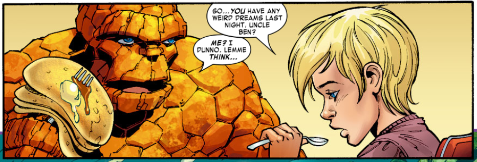 Four and a half: With all this talk of dreams, there’s no mention of Franklin’s former dream-based powers he had in his Power Pack days. Franklin is still powerless during this time, and will be for the foreseeable future.