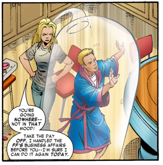 Reed has been up all night, running tests on a pipe from the building. He hopes to track transmutational residue from it back to Diablo’s location. Elsewhere, Sue is in the business office for Fantastic Four Inc., talking to chief financial officer Jian about Johnny’s ongoing work of co-running the company. Jian says Johnny is doing well, and customers like him and are attracted to him. “Like moths to a flame,” Sue adds.