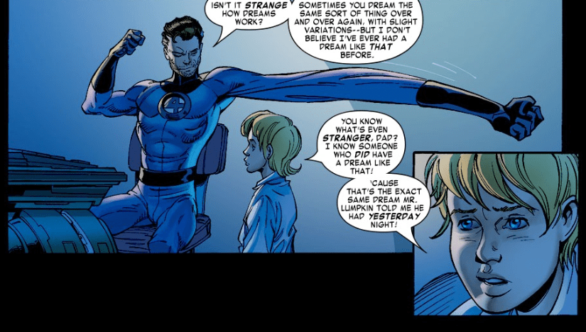 Unstable molecule: Franklin’s dream of Dr. Doom included the sensation of not being afraid of Doom. This suggests that he was having Reed’s dream.