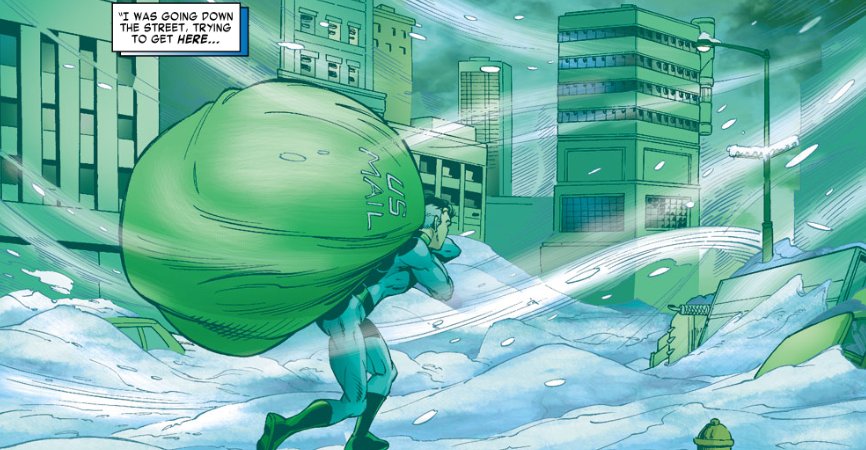 The next night, Reed reveals to Franklin that he too had a strange dream. He saw himself carrying a huge sack of mail through the city during a blizzard, only to attacked by a bunch of the FF’s villains. Franklin then reveals that mailman Willie Lumpkin told him he had the exact same dream. Reed wakes everyone else up and asks about their dreams. Ben had a dream of losing control of the Fantasticar and falling, and Reed says that’s a common type of dream for a child.
