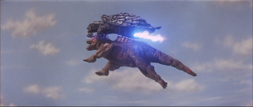 Nice gams: Once again, Gamera can somehow sense when humanity (not just children this time) is in danger, and he flies in from parts unknown to save the day. Gamera attacks Jiger on first sight. Because we know the Earthbound kaiju have all been hibernating since ancient times, can we assume that Gamera and Jiger battled each other before, back in the days of old Atlantis?
