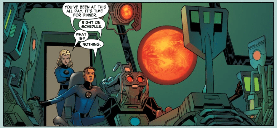 Turn the page, and Reed is our narrator, watching all this play out on a tiny planet inside his lab. Sue interrupts to tell him they’re having dinner with their new accountant, Mr. Onoffon. Reed has no interest in this. He’s feeling depressed, saying, “Some days I have more questions than I have answers.” He and Sue strike the same pose that two of the aliens from his tiny planet had on the first page.