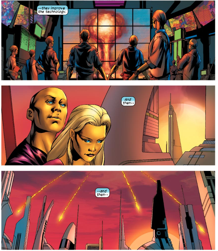 The issue begins on an alien world, where an unseen narrator has been studying the place for five years and “the end is always the same.” Time passes faster on the planet than it does for the narrator, so that we see the rise of civilization over a short time. The society becomes advanced in arts and culture, but also warfare. It comes to an end with falling missiles and mushroom clouds. The lone survivor of this apocalypse simply asks “Why?” As he dies.
