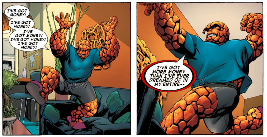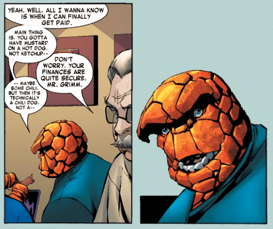 The FF meet with Onoffon, and we catch up to what’s happening with the FF’s finances. During the time when the team was broke in the Marvel Knights series, Reed managed to develop some new patents to bring in fresh income, but now he owes income tax on those new patents, and is now being audited. Ben jokes about wanting to get paid, and Onoffon says his fortune is secure. Turns out that when the FF was broke it was only Reed, Sue, and Johnny’s percentages that were turned over to the government, because Reed has power of attorney for himself, Sue, and Johnny. Ben, however, didn’t lose his one-fourth of the business. He still has all his FF money from before. Got all that?