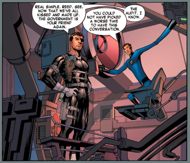 Later, Nick Fury visits Reed, saying that the S.H.I.E.L.D. and the US government are willing to forgive the FF for the Latveria incident (long story). Fury says the government wants to hire Reed as a consultant on a confidential project, Reed can only offer with an address and a date to begin, and no other info. Reed agrees. This is followed by a gag of Ben sitting on the FF’s Xerox machine, photographing his own butt.