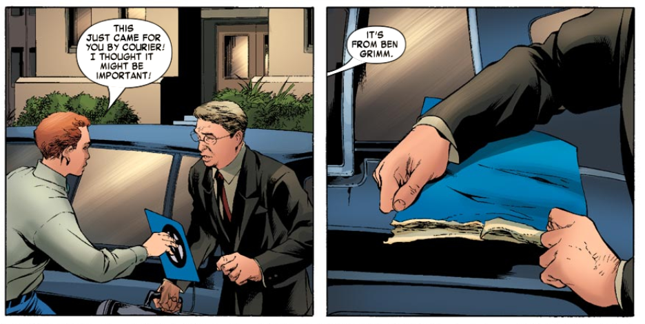 That night, Reed explains to Sue that they could use the money, and it’s important to get back on good terms with the US. He reveals to her that the meeting is scheduled the next morning at an air force base in Nevada. He plays some music for her, that he says comes from “very far away,” and we the readers surmise that music came from the planet and the start of the issue. Then there’s a gag where Bill Gates gets a package from Ben, containing what Gates thinks is a photo of the Grand Canyon. Get it???
