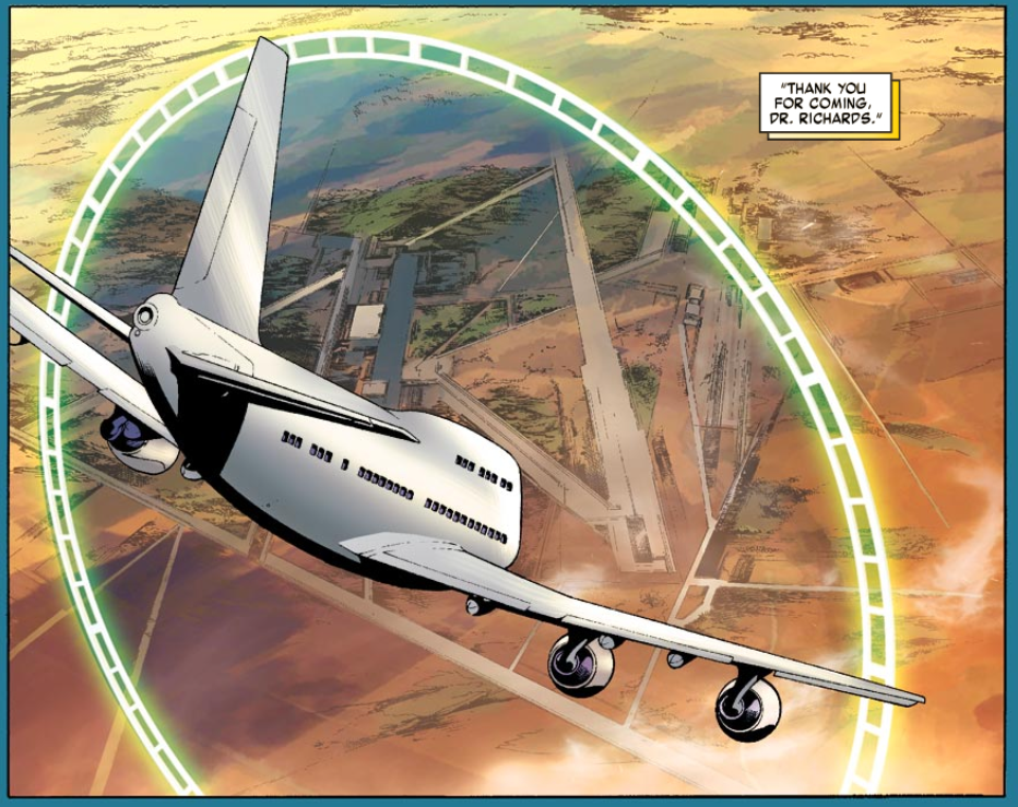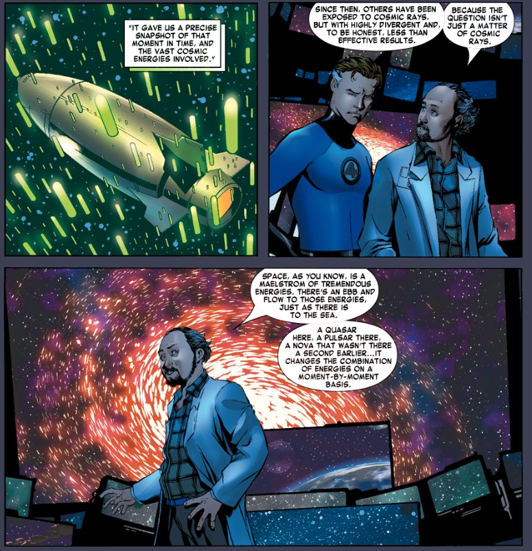 Reed arrives at a top-secret hidden base in Nevada. His plane must fly through some kind of shield or portal to get to it. Reed meets with a unnamed scientist, whom the Marvel Wiki identifies as Dr. Crane. He hints that the base was paid for by the funds the government seized from FF inc. Crane has been studying the cosmic rays that gave the FF their powers. He says attempts to recreate that event have been inconsistent, because it required a multitude of factors all meeting in the right quantities and the right moment in time. He says that the event, nicknamed “the jackpot” is about to happen again in just a few weeks.