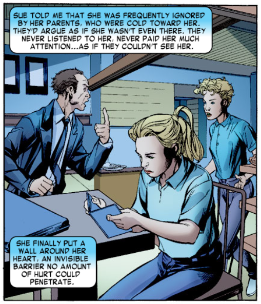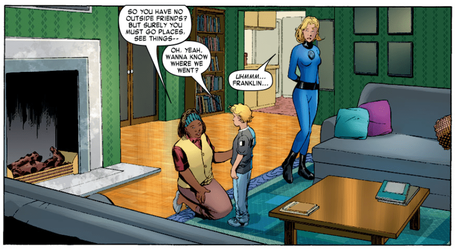 Debouvier then talks to Franklin, who admits he doesn’t go to school but is taught by his parents. She asks about outside friends and places he’s been. Franklin retells the Latveria incident from his point of view, including him being stuck in Hell for a while. Sue tries to brush this off as “Kids, they say the darndest things.” Debouvier asks Franklin where his father is, and he says, “Nobody knows.”