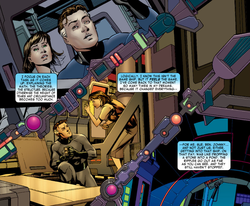In Nevada, Reed again meets with Dr. Crane, who introduces fellow scientist Dr. Debra Love. She says they’ve had to make intuitive leaps in recreating Reed’s original spacecraft down to the smallest detail. In caption narration, Reed remarks on how this is like stepping into his past, and how one fateful choice of his changed his and so many other lives forever. He adds that this is making him feel old.