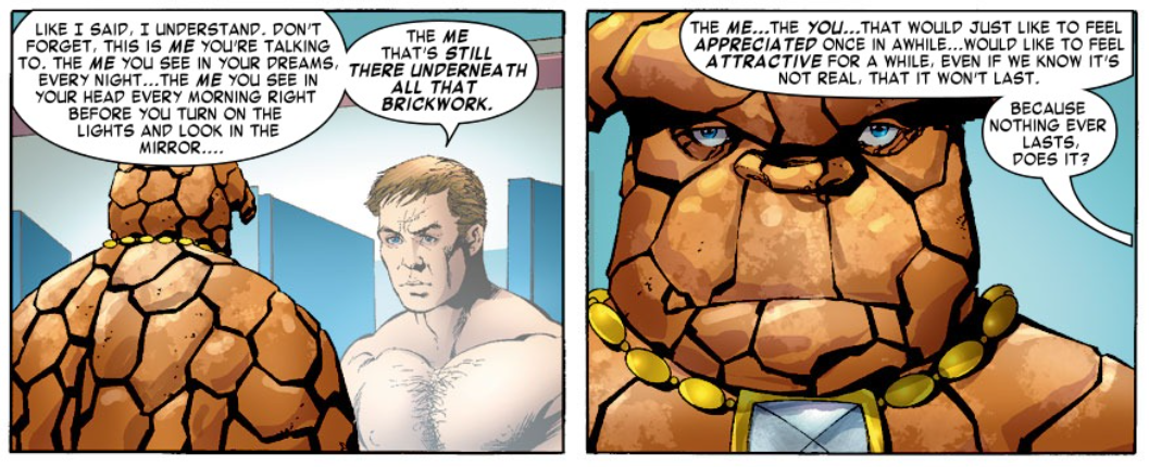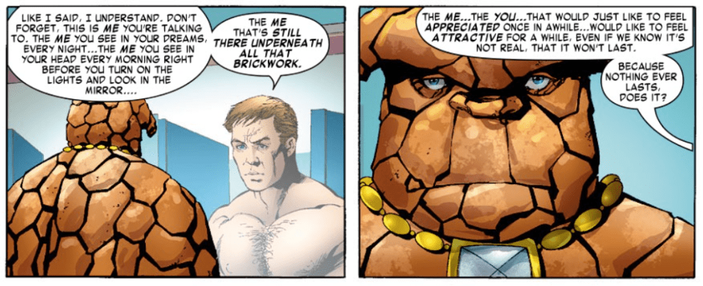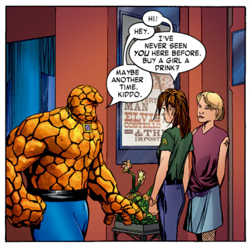 Clobberin’ time: In his daydream, Ben remarks that he’s still in love with Alicia. This is something of a big deal, because they separated way back in issue #265. Although Alicia is still one of the family, both she and Ben have had other potential love interests since then.
