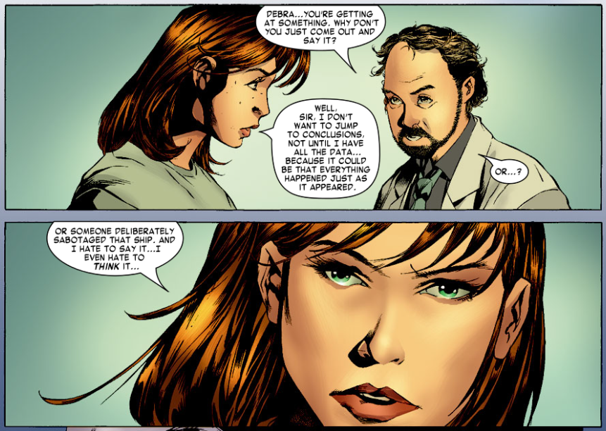 Sue meets with Debouvier, who is not there to organize a fundraiser. She’s opening an investigation into whether Franklin and Valeria are in a safe environment, or if they should be relocated. She argues that FF headquarters has been attacked and damaged on regular occasions, that “persons of dubious character” have been seen coming and going from the building, and that the kids are often left along for prolonged periods of time. Debouvier asks about the children’s babysitters. Rather than say the Inhumans watch the kids, Sue lies and says, “They’re from New Jersey.”