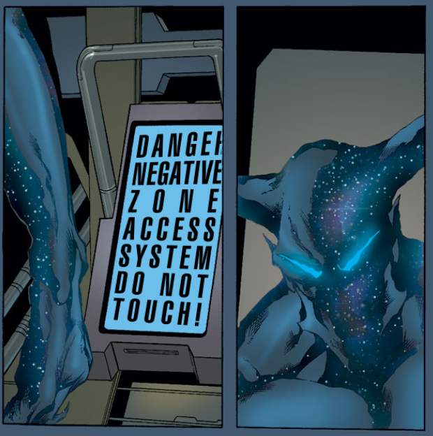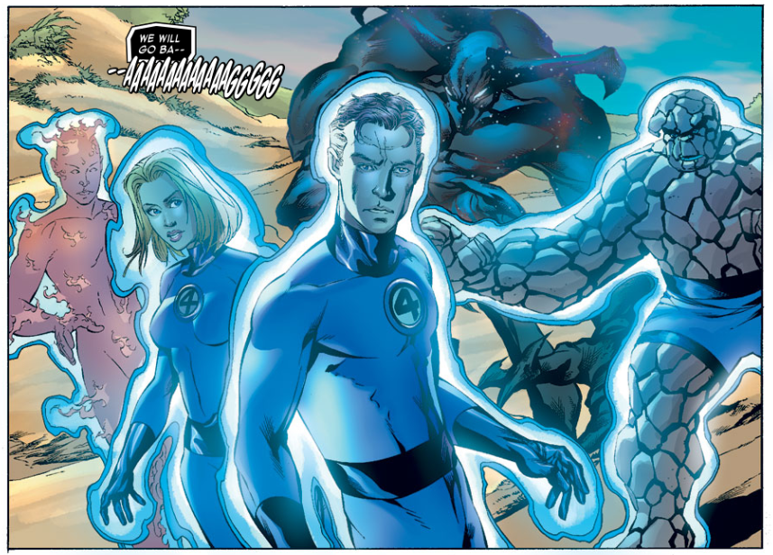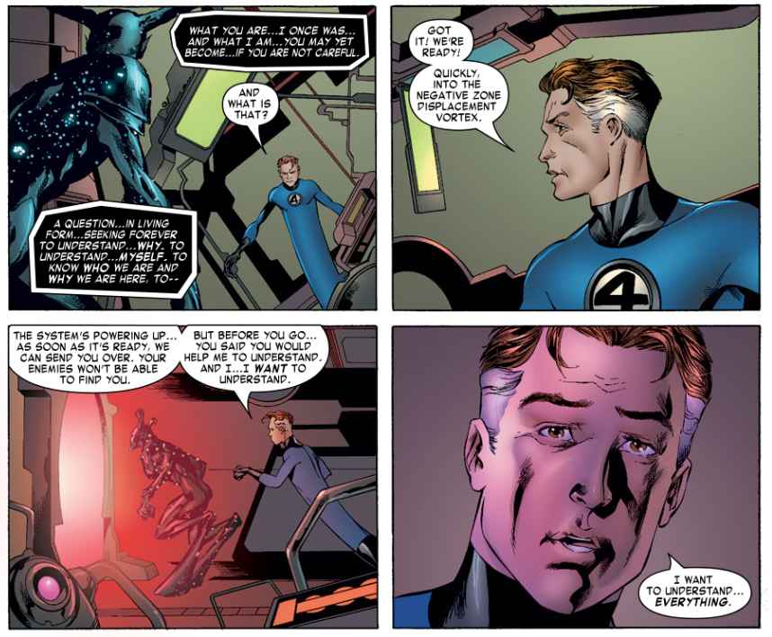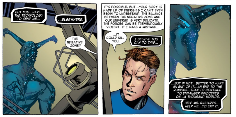 The Entity contacts Reed telepathically. Reed leaves the others to the fight and joins the Entity in the lab. The Entity says the Negative Zone is the one place where he can go that his people cannot find him. Reed says it’s too dangerous, but the Entity is willing to take the risk. He says it’s better to end it all than to keep running.