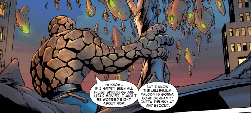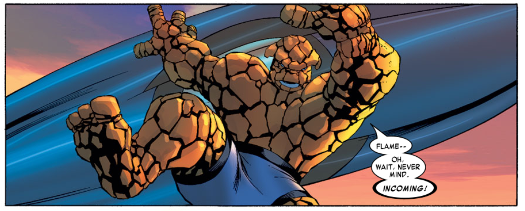 Sue takes the alien down to Reed’s lab, with Reed naming the alien “the Entity” for the first time, making it his name from now on. Johnny is tasked with getting the kids to safety, and Reed slingshots Ben into the sky to clobber the alien ships. Inside, the Entity takes notice of the Negative Zone portal, which hilariously has a big “Do not touch!” sign.