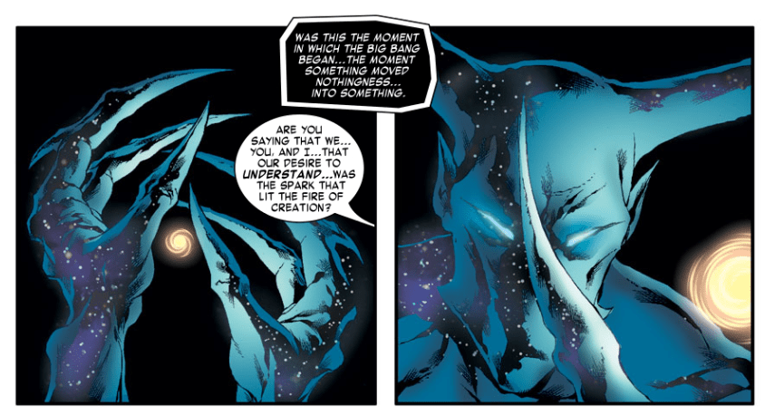 Reed further elaborates that he is touching the fabric of creation itself, and he’s being hurtled backwards millions of years through time. He and the Entity end up surrounded by darkness, which the Entity says is the void, a time before the big bang. The Entity obsesses over how life came to exist from nothingness. He adds that he must also understand himself. A light appears, and the Entity says it came from “that which is the galaxy within me.” Reed asks if the Entity’s desire for understanding is what caused the big bang. The Entity says, “There is but one way to be sure,” and, “Let there be light.”