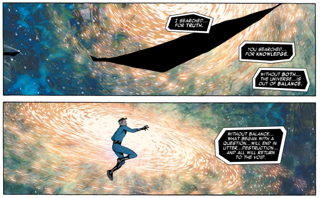 This issue begins with Reed floating in space as he witnesses the origin of the universe. He says it’s too much even for his mind to comprehend. He further says “This isn’t how it’s supposed to work,” and that it’s all just chaos. He says it’s all unstable, with forces of energy fighting against one another.
