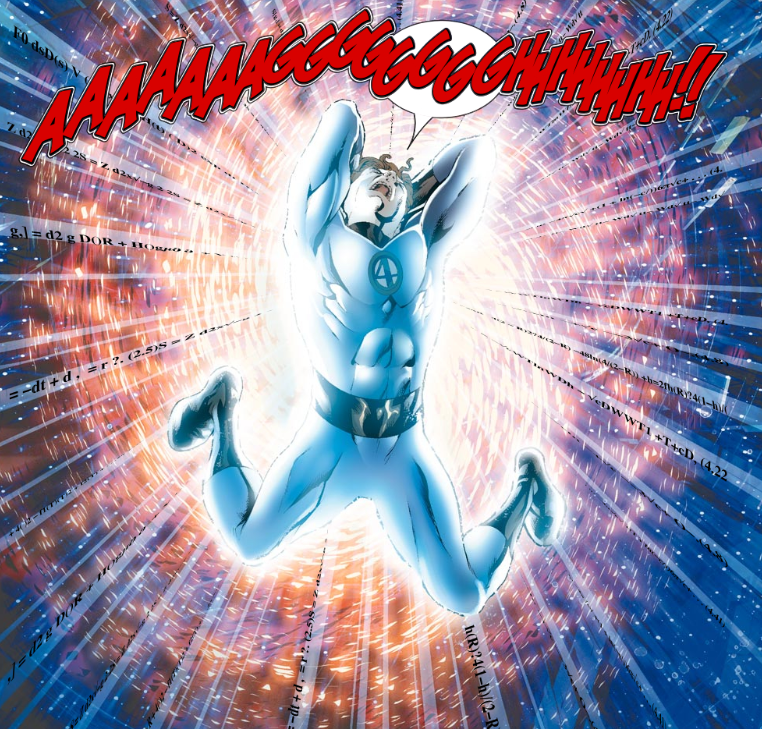 How to recap all this? Reed took a job with the government, who wanted to recreate the FF’s original spaceflight with a bunch of astronauts. Deducing that the cosmic rays that gave the FF their powers contained a message from unseen aliens, Reed sabotaged the astronauts’ flight and went on the run. He and his teammates then met the Entity, the alien who sent the message. He wanted to find other seekers of the truth like himself. The Entity’s people, who accused him of being a heretic, arrived on Earth and attacked. The Entity and Reed tried escaping into the Negative Zone, but the portal was damaged, sending them to a void before the creation of the universe. The Entity, wanting to understand all things, went ahead and created the big bang. Got all that?