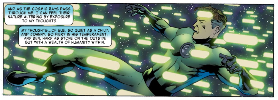 Cosmic rays then appear, blasting through Reed. He says he can feel his thoughts affecting the rays, and his mind dwells on his three teammates, so far away. He then deduces that those thoughts are the message inside the rays, eventually turning into the force that gave the FF their powers. The intelligence behind the origin of the FF was Reed himself.