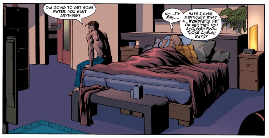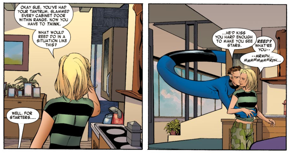 Fade out: After spending the night together, Sue says she’s thankful for the cosmic rays, suggesting that Reed used his powers in creative ways in bed. Has Banky from Mallrats read this issue?